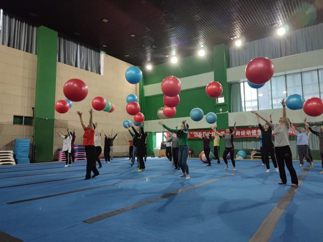 姜桂萍向大家介绍了健康球命名的由来、起源和发展,以及运动中的注意事项;接着通过一系列基础性身体练习的示范和讲解,带领大家使用健康球进行了单人、双人和多人的配合练习,随后带领各位老师进行了单球和多球练习;最后通过音乐与动作相结合的方式,老师们进行了韵律活动和集体小游戏。