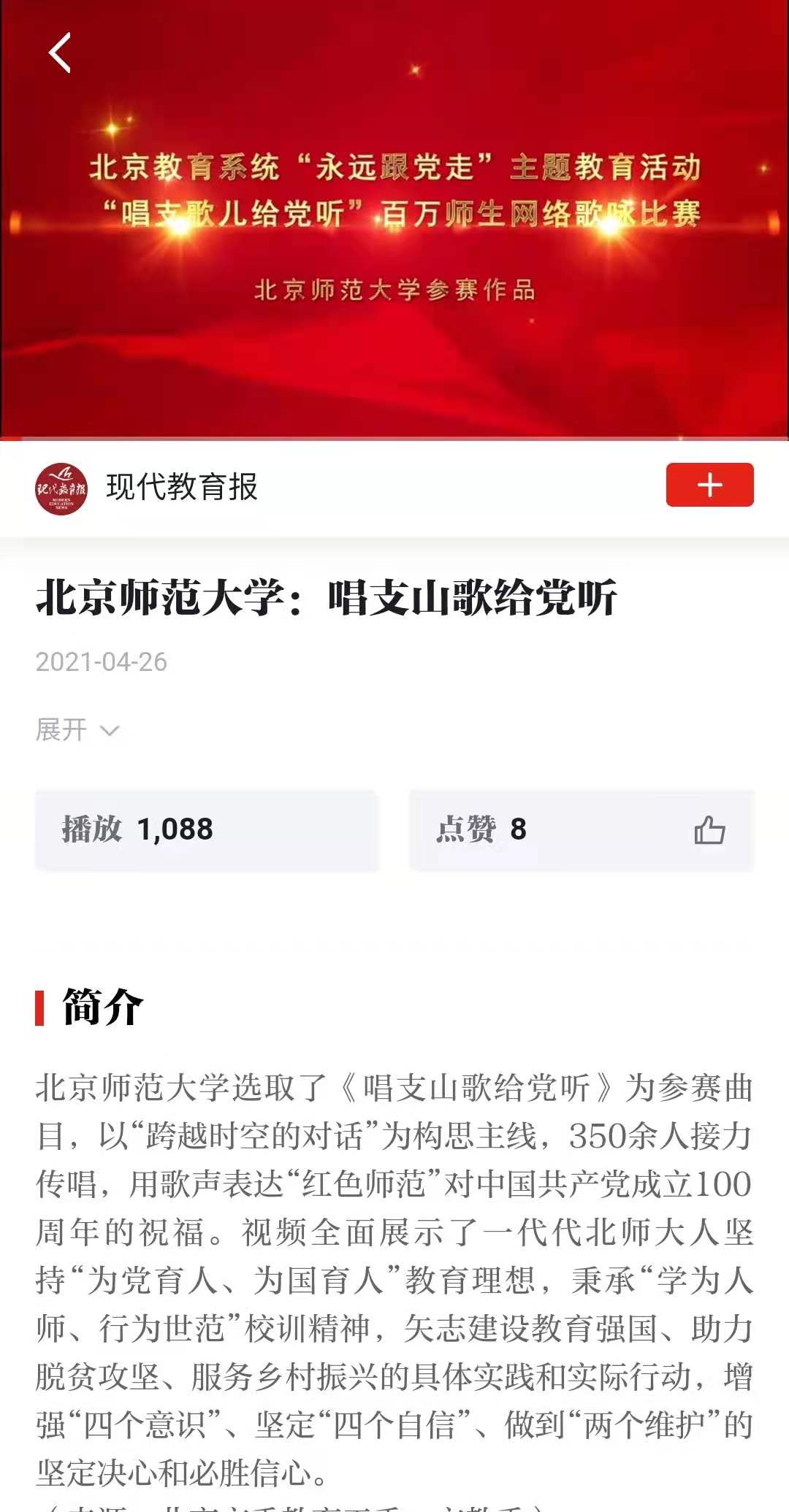 《唱支山歌给党听》已在现代教育报、人民网、mjm世界杯官网官方平台等渠道相继推出,欢迎大家积极转发!