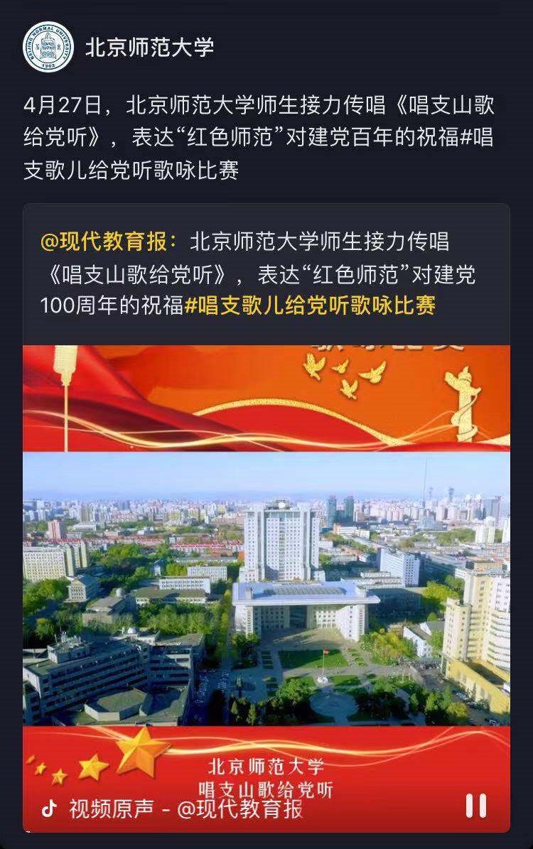 《唱支山歌给党听》是由校工会、校团委、党委宣传部(新闻中心)牵头策划,艺术与传媒学院、北师大实验小学、珠海校区等联合出品。视频以“跨越时空的对话”为构思主线,350余人接力传唱,用歌声表达“红色师范”对中国共产党成立100周年的祝福。以北师大两校区多校园为背景,配以党史校史资料、师生校友动人事迹,展示了一代代师大人坚持“为党育人、为国育才”教育理想,秉承“学为人师、行为世范”校训精神,矢志建设教育强国、助力脱贫攻坚、服务乡村振兴的具体实践和实际行动,增强“四个意识”、坚定“四个自信”、做到“两个维护”的坚定决心和必胜信心。