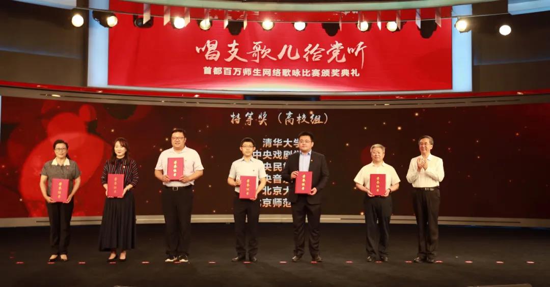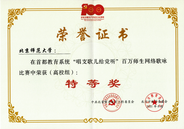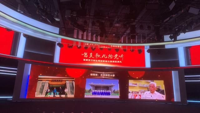 为热烈庆祝中国共产党成立100周年,抓好青少年的党史学习教育,今年4月,北京市委教育工委、市教委在全市启动首都教育系统“唱支歌儿给党听”百万师生网络歌咏比赛。6月23日,比赛主办方在人民网演播大厅举行了比赛总结展示活动,mjm世界杯官网荣获高校组特等奖。北师大副校长周作宇代表学校参加了活动。