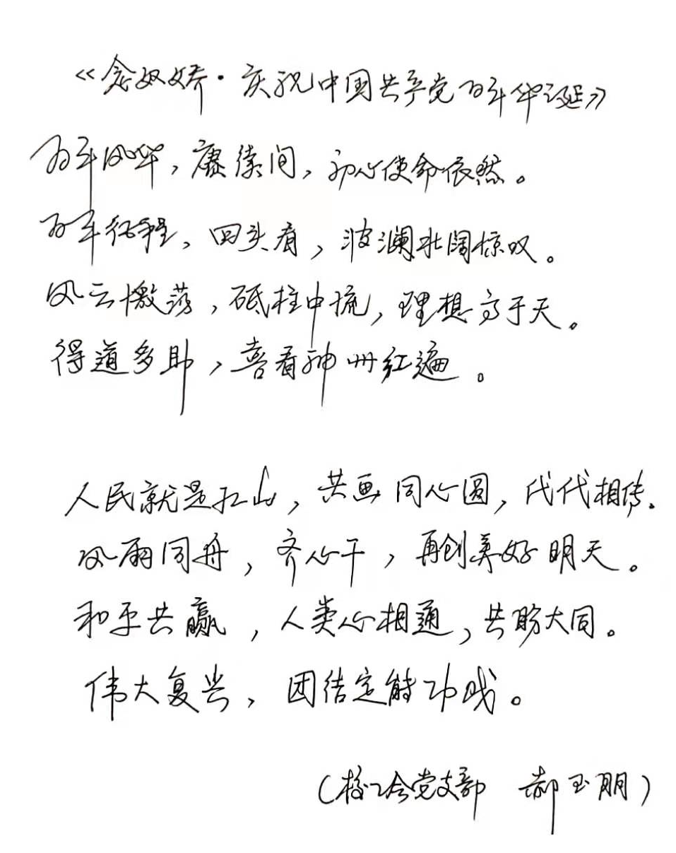 在中国共产党百年华诞之际,作为9500多万中国共产党员中的一份子,在校工会党支部的组织下,我通过观看庆祝中国共产党成立100周年大会现场直播,聆听习近平总书记铿锵有力的重要讲话,感受现场观众欢快振奋的浓浓氛围,心潮澎湃,思绪万千,我为中国共产党创造的丰功伟绩而骄傲,我为自己是一名光荣的中国共产党员而自豪!在这举国同庆的荣耀时刻,学作词一首,表达对党的祝福和对美好生活的向往。