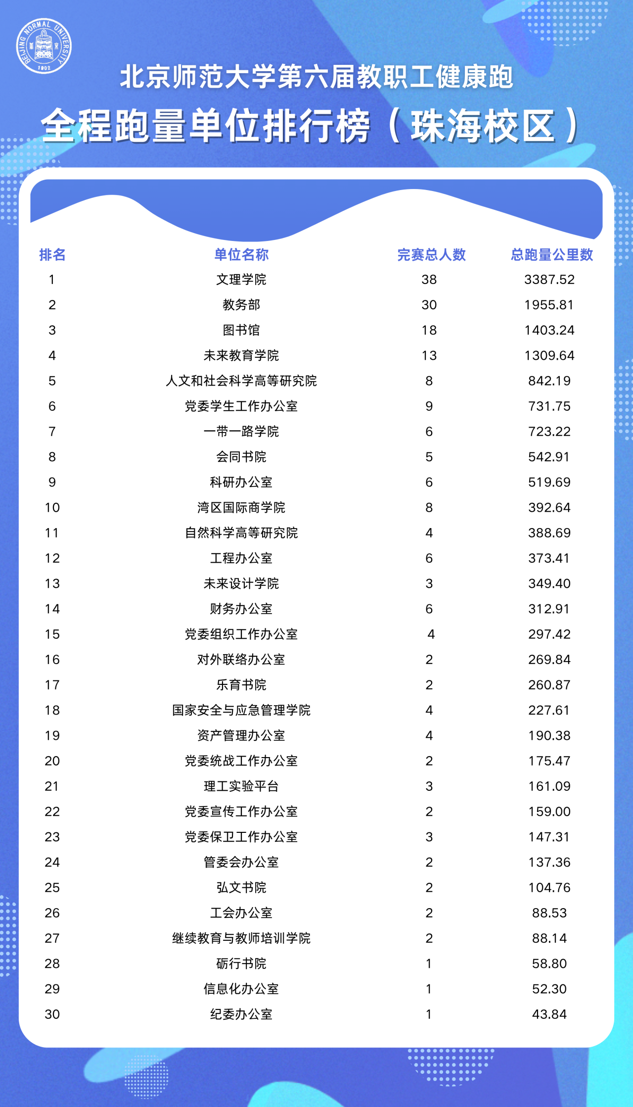 健康跑全程单位跑量(公里数,下同)排行榜前三名:北京校区:总务工会38852.14,资产经营有限公司工会31561.92,实验幼儿园工会17059.49。珠海校区:文理学院3387.52,教务部1955.81,图书馆1403.24。