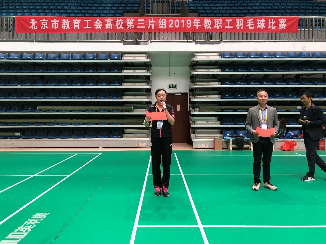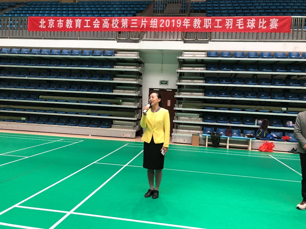 北京邮电大学工会常务副主席邓丽敏代表羽赛组委会致词,向晋级的两所高校表示祝贺,向全体参赛队员表示感谢,希望大家在三片组的文体活动平台上切磋技艺、展现风采、加深交流,共同建设美好的片组家园。