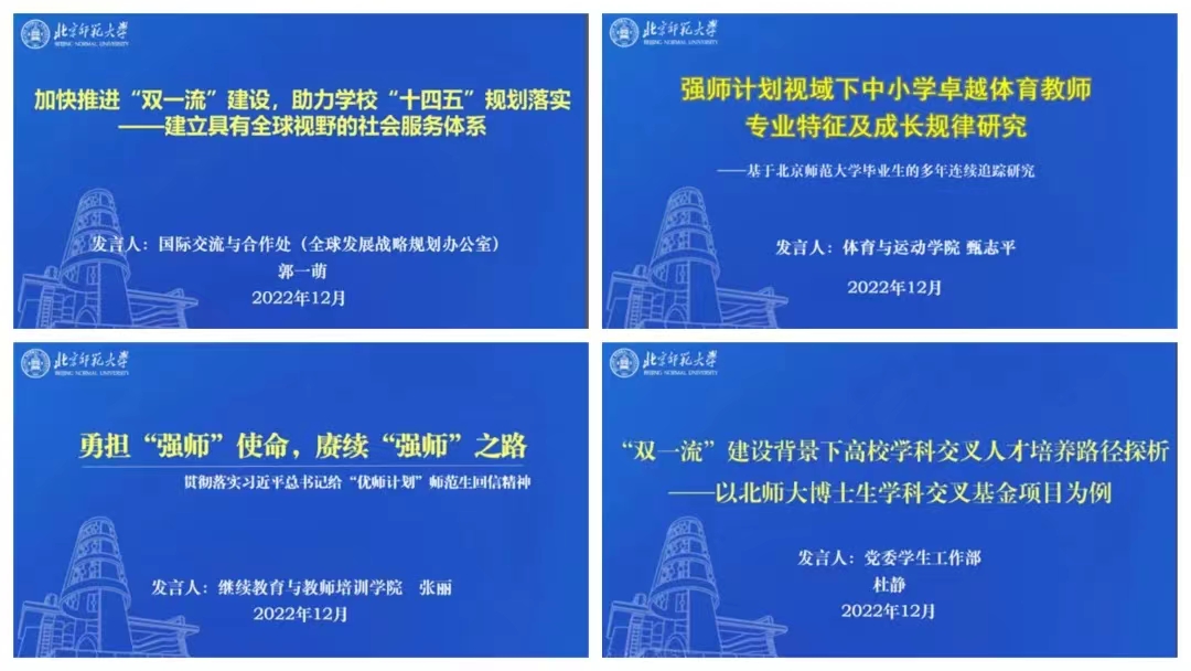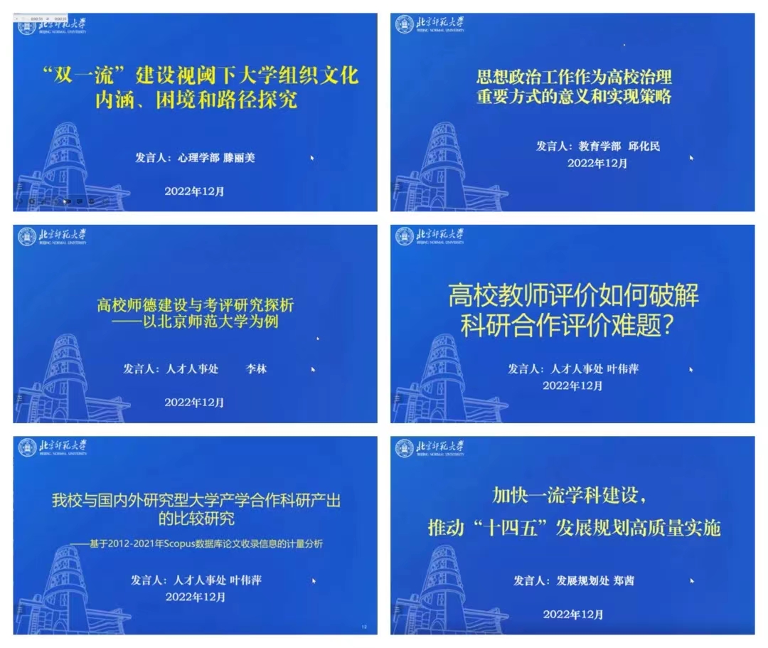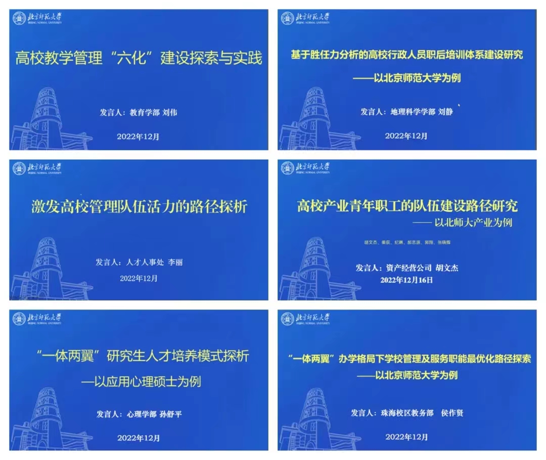 下午,国际交流与合作处郭一萌、体育与运动学院甄志平、继续教育与教师培训学院张丽、党委学生工作部杜静、教育学部刘伟、地理科学学部刘静、人才人事处李丽、资产经营公司胡文杰、心理学部孙舒平、珠海校区教务部侯作贤等十位老师先后展示获奖优秀论文,从各自的专业领域着手,以社会服务、毕业生职业发展轨迹、胜任力等角度,聚焦强师工程、“双一流”学科、“一体两翼”建设提出了深入思考和有益建议。