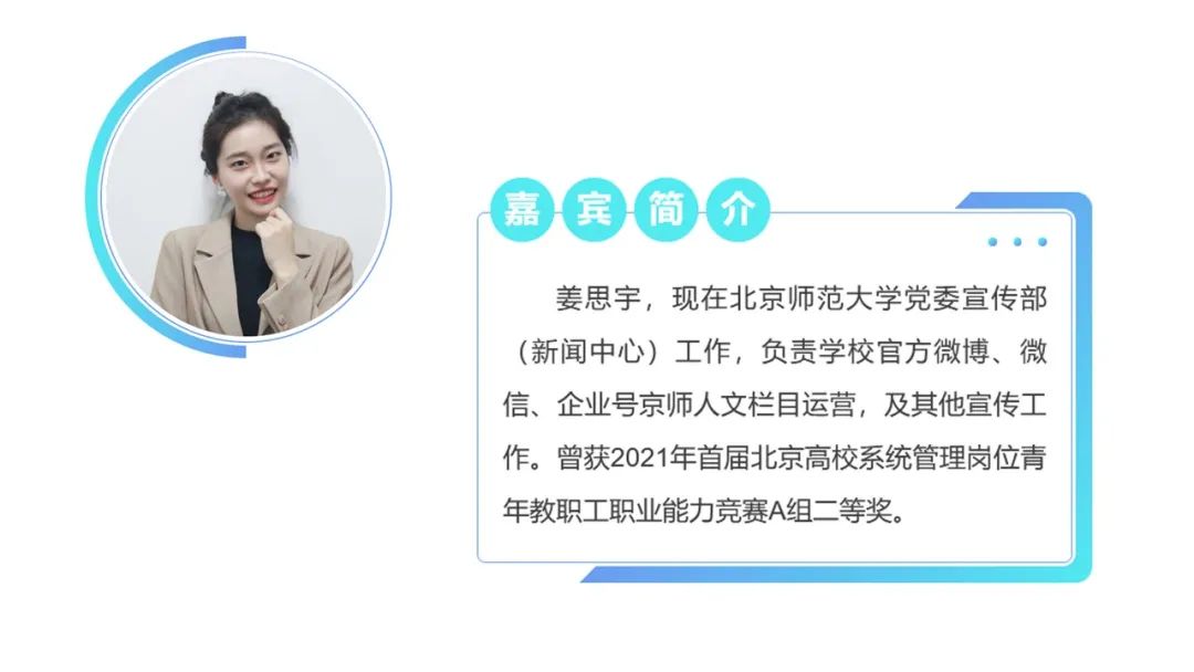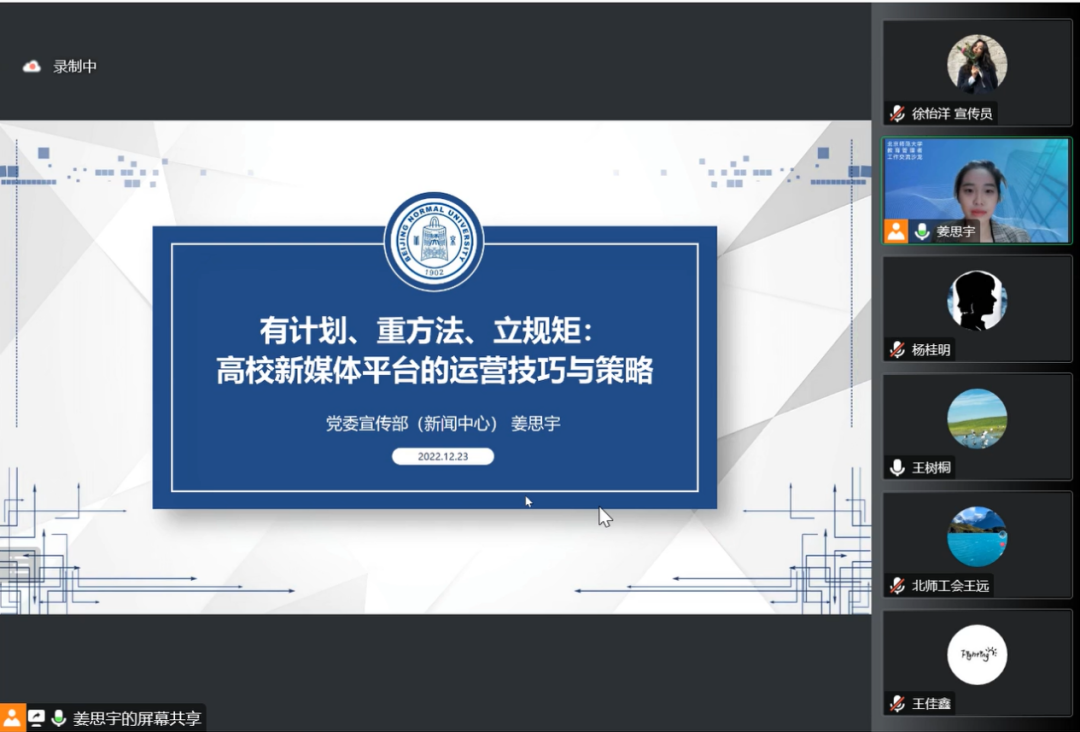 本次交流沙龙内容丰富,实用性强,姜思宇运用贴切的案例、精彩的分析,分享了新媒体视域下加强高校新媒体平台管理工作的有效路径,既有理论深度,又有实践广度,对于教育管理者学习新媒体平台运营策略、开阔眼界思路提供了有益的思考与宝贵的建议。