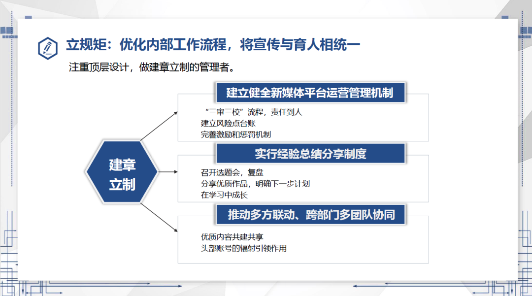 姜思宇强调,做好高校新媒体平台运营工作,要不断优化内部工作流程,将宣传与育人相统一。不仅要加强团队建设,做立德树人的培养者,同时也需要注重顶层设计,做建章立制的管理者,在此基础上学习借鉴优秀的微信公众号勤奋、主动、共情、新媒体化的特征,提升新闻宣传工作水平。