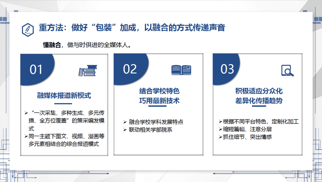 姜思宇指出,面对新的宣传平台与环境,首先要在选题和内容上下功夫,关注国家和社会层面的重大节点、聚焦学校的重大事件、结合师生生活,挖掘读者喜闻乐见的校园故事,统筹规划,做有重点、有节奏的宣传工作者。同时,要把握传播规律,在新闻外观和设计上进行优化融合,不断创新,做与时俱进的新媒体人。